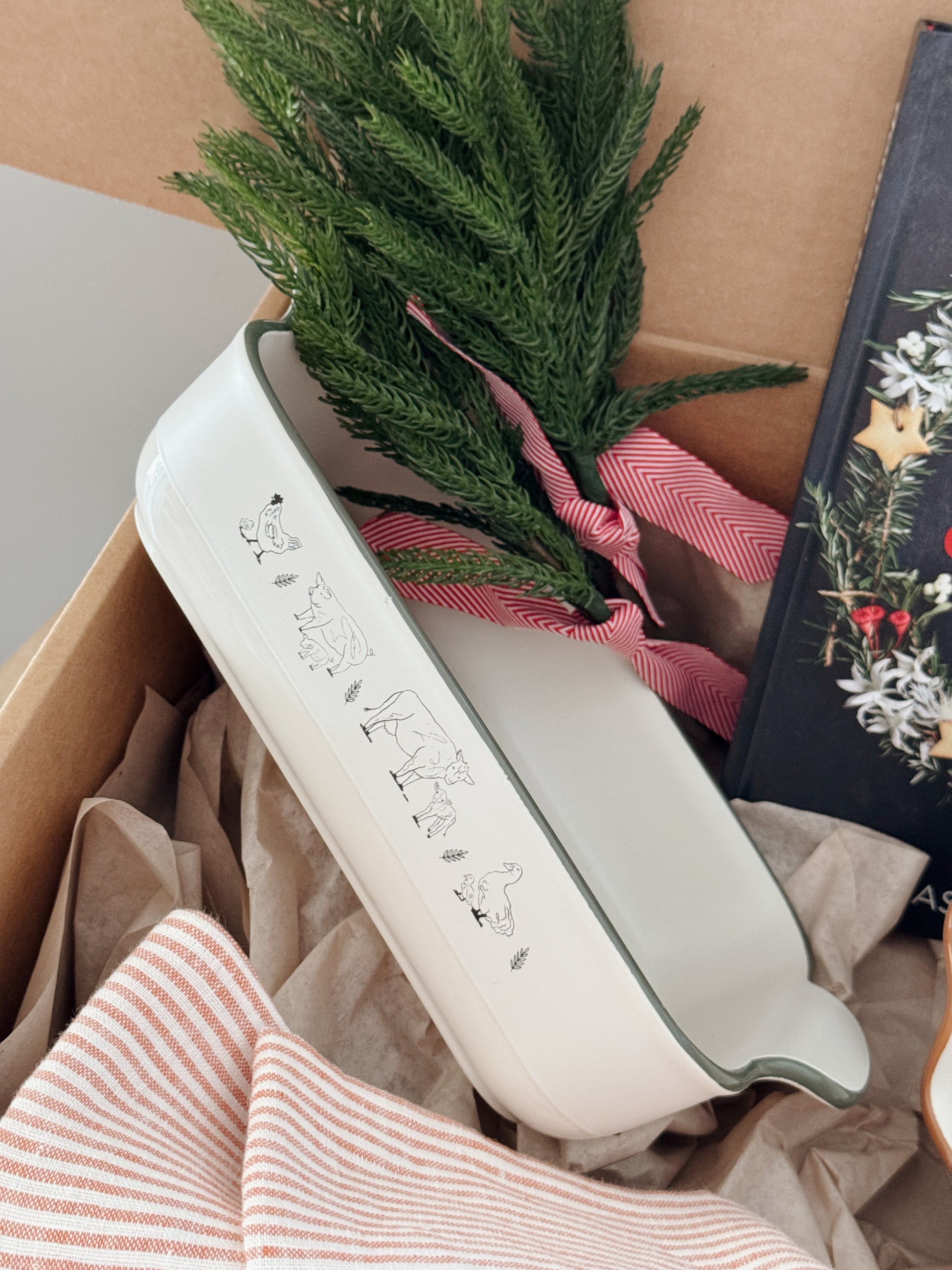 Spread holiday cheer with this charming gift box brimming with festive essentials! This curated collection features a whimsical cow-patterned small baker, a matching fluted pie dish perfect for your favorite desserts, the beloved Donna Hay Festive Feasts cookbook bursting with seasonal inspiration, and two coordinating kitchen towels. Whether you're treating yourself or delighting a home cook, this Country Charm set brings warmth, style, and culinary joy to any kitchen this holiday season.